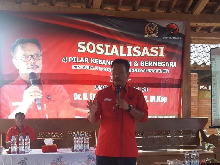 GROBOGAN, JMI - Anggota MPR RI H Edy Wuryanto menggelar sosialisai empat pilar kebangsaan bersama para kader PDIP khususnya yang ada di dapil lV meliputi Kecamatan Gubug dan Kedungjati bertempat di aula pendopo rumah joglo Desa Kwaron Gubug yang juga termasuk rumah kemenangan PDIP. Senin 28-03-22